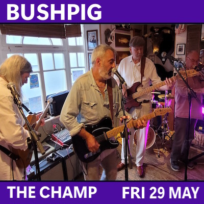 Bushpig are, in their own words, five gracefully maturing chaps in caps and whiskers playing an eclectic mix of soulful and bluesy grooves. What’s more, they do a mean skiffle, blues, reggae and pop. They consist of Richard Malfait, Jim Crawford and Dayle Helsby on strings and songs, Beats Blofeld on sticks and Jaggs on the ‘bone. Bluesy shuffles, soulful grooves, caps and whiskers. If you want to know more, come along to the Champ and let your ears enjoy the groove.