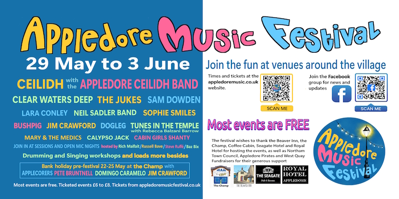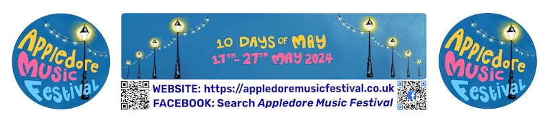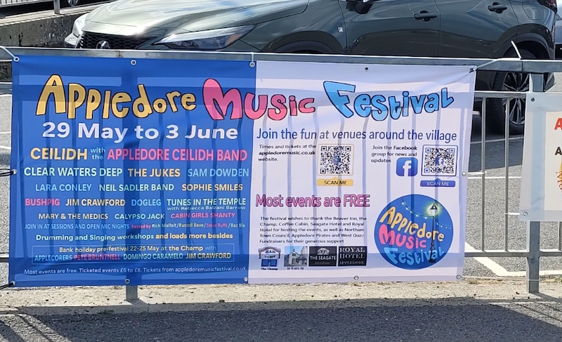 Every year, the festival organisers prepare a banner to display on the quay. Another banner is erected at the Appledore turn-off on the A386 in Northam to catch the attention of passing traffic. Here they are.